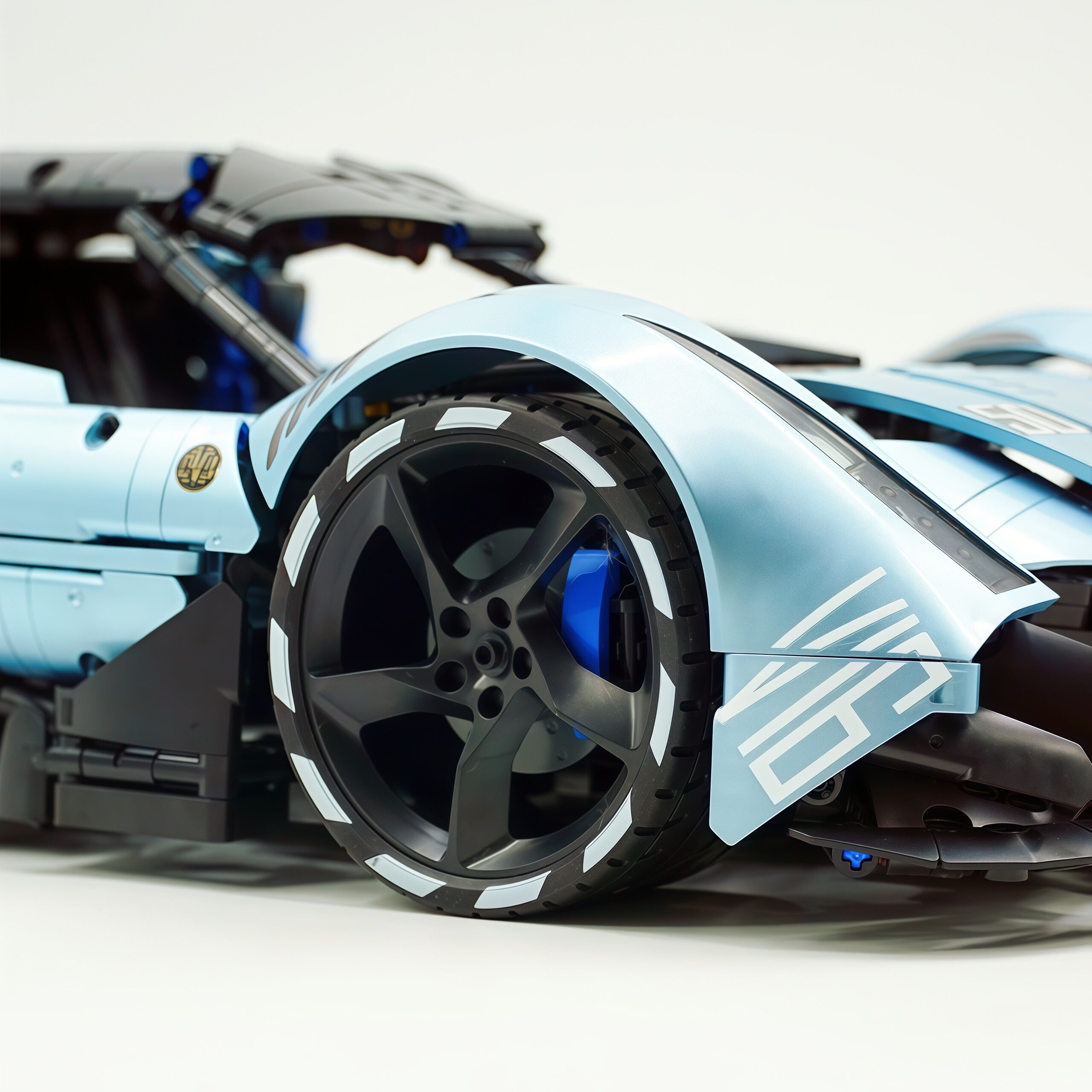The experience deepens with opening butterfly doors, a detailed interior, and a functioning steering wheel that connects you directly to the machine. Aerodynamic force is on full display with a massive front splitter, rear diffuser, and a huge dual exhaust system that defines its rear profile.